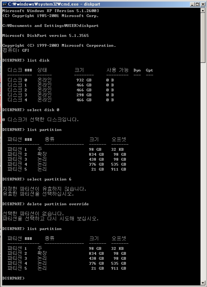 DISKPART> select partition 0 (ÁöÁ¤ÇÑ ÆÄƼ¼ÇÀÌ À¯È¿ÇÏÁö........) DISKPART> delete partition override (¼±ÅÃÇÑ ÆÄƼ¼ÇÀÌ ¾ø½À´Ï´Ù.... )